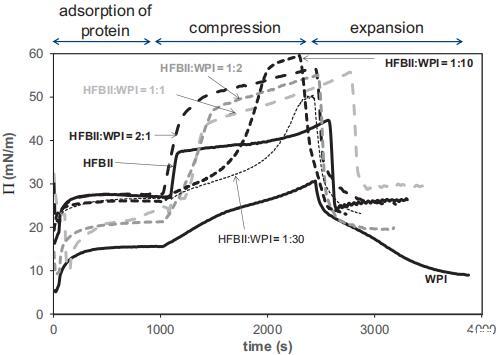 值得注意的是,對于純HFBII,П–A等溫線在連續(xù)的壓縮膨脹循環(huán)中不會(huì)發(fā)生變化,這再次表明HFBII不可撤銷地附著在界面上,幾乎沒有任何構(gòu)象變化。對于純WPI和1:1混合物,П–A等溫線略微向較小區(qū)域移動(dòng),這表明由于WPI分子的構(gòu)象變化、多層形成或如前所述,由于WPI的解吸,表面重排的可能性較小。