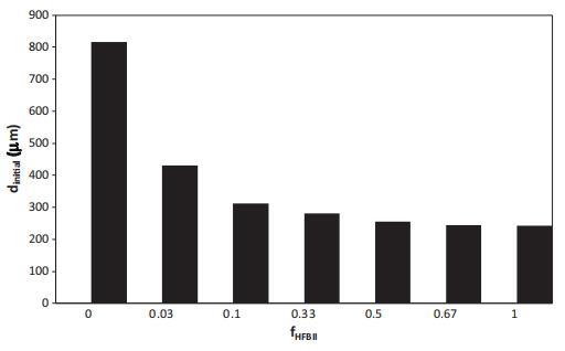 圖8給出了以與圖3相同的HFBII:WPI比率制備的兩種泡沫的初始?xì)馀莩叽?。最重要的觀察結(jié)果是,少量HFBII(來自fHFBII 0.03)在很大程度上影響泡沫的初始?xì)馀莩叽?。此外,似乎從WPI主導(dǎo)向HFBII主導(dǎo)的行為轉(zhuǎn)變發(fā)生在fHFBII~=0.2,對應(yīng)于朗繆爾槽中吸附層中觀察到的轉(zhuǎn)變(圖6)。