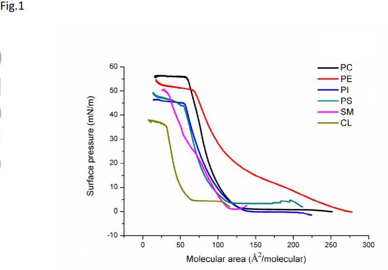 圖1顯示了空氣-水界面上不同磷脂單層的π-A曲線形狀。這里測(cè)試的所有磷脂的π-A曲線的形狀都是在所有顯示的表面壓力下單一液體膨脹(LE)和液體冷凝(LC)狀態(tài)的特征。在壓縮時(shí),單層經(jīng)歷了一個(gè)轉(zhuǎn)變,這被視為從LE(低于10 mN/m)到LC狀態(tài)的轉(zhuǎn)變。在高分子區(qū)域,由于分子堆積的增加,表面壓力升高,但不改變單層膜的彈性。最后,單分子膜達(dá)到了一種更為濃縮的狀態(tài),但在π-a等溫線的形狀中沒(méi)有明顯的崩塌點(diǎn)。對(duì)于這里測(cè)試的磷脂,它們都可以形成穩(wěn)定的膜,并表現(xiàn)出良好的壓縮性能,DOPC的表面壓力甚至達(dá)到57 mN/m。