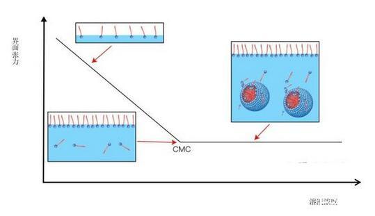 但是當(dāng)濃度超過(guò)一個(gè)點(diǎn)時(shí),表面活性劑會(huì)開(kāi)始抱團(tuán),形成膠束,界面張力不再下降,這個(gè)濃度叫做臨界膠束濃度。