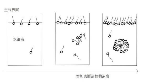 我們?cè)谖恼麻_(kāi)頭介紹過(guò),表面活性劑是一種兩親的分子,一頭親水一頭親油。因此,低濃度時(shí)表面活性劑傾向于留在水的表面,親油(厭水)的一頭朝外,首先布滿水面,也就是水-空氣界面,所以會(huì)降低這個(gè)界面的張力。