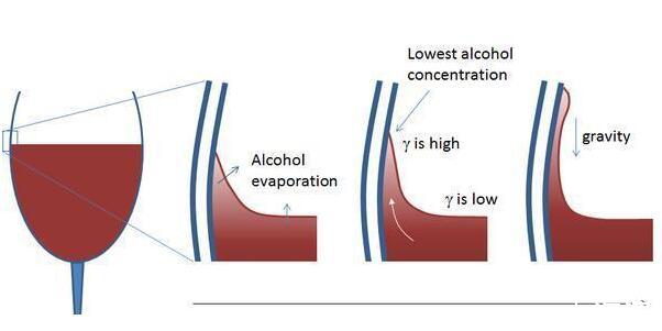 瑪拉高尼效應(yīng)不光存在于物理實驗和我們之前開的玩笑之中,在我們的日常生活中也有馬拉高尼效應(yīng)的體現(xiàn),這一現(xiàn)象可能每一個人都見過,那么就是我們在喝酒的過程中看到的所謂的好酒會掛壁的現(xiàn)象。就算再好的酒,它也是有水在其中的。好酒中的酒精由于毛細(xì)效應(yīng)爬到高處的時候,酒精蒸發(fā),使得處于上層的酒液的酒精含量相比較于下層來說要低,而同時的酒的表面張力要比水小,兩種液體表面張力的差距就形成了馬拉高尼效應(yīng)。