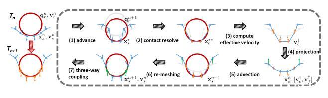 我們的耦合系統(tǒng)分為三個部分:流體,表面層,固體。流體部分我們采用傳統(tǒng)的歐拉網(wǎng)格的模擬方法,在交錯網(wǎng)格(Staggered Grid)上用算符分離的方法求解離散不可壓的Navier Stokes方程。固體部分采用傳統(tǒng)的拉格朗日方法求解牛頓方程。我們的主要貢獻在于在流體與固體之間插入了一層有質(zhì)量、有厚度的流體表面層,這個表面層直接對應我們上面介紹的流體表面分子稀疏的部分。因為這個表面層非常薄,我們可以使用帶虛擬厚度的單層三角網(wǎng)格來表示,然后在這個表面層上施加表面張力勢能。為了將這三個部分耦合起來,我們在表面層和背景網(wǎng)格、固體和背景網(wǎng)格之間定義了速度的插值矩陣,同時將流體的壓強作用在表面層和固體上,以及將表面張力作用在固體上,這樣我們將這三部分寫進一個三相耦合方程里進行統(tǒng)一求解和更新。最終我們算法的流程如下: