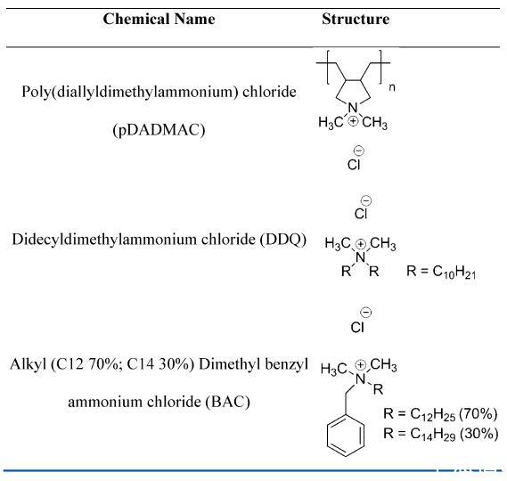 試劑和樣品制備。pDADMAC,Mv=8.5 kDa,作為28 wt%的水溶液從Poly Sciences Inc.獲得,pDADMAC,Mv=21和140 kDa,分別作為35和20 wt%的溶液從Sigmaldrich獲得。DDQ從Lonza(商品名-Lonza Bardac 2240)獲得,并以40 wt%的水溶液形式收到。BAC從Thor(商品名-Activide BAC 50 M)獲得,并以50 wt%的水溶液形式接收。通過(guò)在80°C的真空烘箱中干燥,通過(guò)重量法驗(yàn)證上述儲(chǔ)備溶液的濃度,直到未記錄進(jìn)一步的質(zhì)量損失。每個(gè)樣品進(jìn)行三次重復(fù)測(cè)量,并記錄平均結(jié)果。除非另有說(shuō)明,否則表面活性劑和聚電解質(zhì)均按原樣使用,無(wú)需進(jìn)一步純化(表1)。