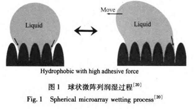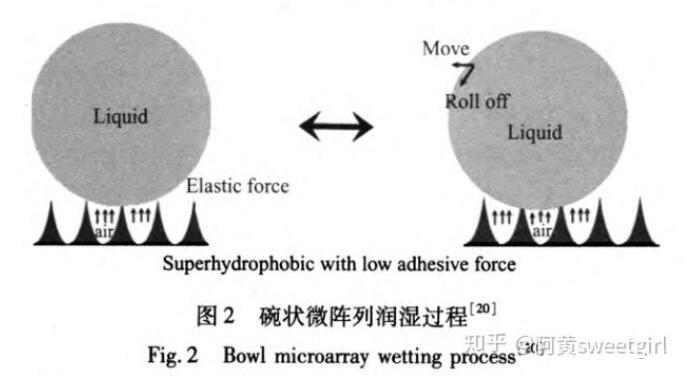 有評(píng)論說(shuō)疏水高粘附的界面也會(huì)存在,然而這是具有特殊微納米結(jié)構(gòu)的表面,比如玫瑰花瓣等,這類(lèi)的界面對(duì)微結(jié)構(gòu)的幾何性質(zhì)要求較高。而通常的情形下,微納米結(jié)構(gòu)的存在會(huì)使疏水的界面出現(xiàn)超疏水的現(xiàn)象,其粘附力會(huì)更低,比如荷葉的表面。如下圖中,上面的是疏水高粘附,下面是疏水低粘附的界面,然而這時(shí)由水與界面的接觸面積決定的,接觸面積越大,其粘附力越大,否則會(huì)越小。這是在化學(xué)性質(zhì)相同時(shí),從微結(jié)構(gòu)的角度考慮的粘附力。這種疏水高粘附是與平整的高粘附界面相互比較來(lái)說(shuō)的,然而其是否一定比親水的物質(zhì)粘附力大未曾可知。