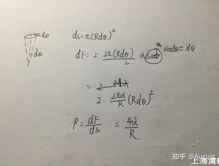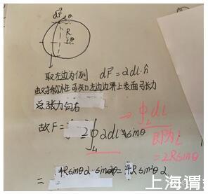 這個(gè)張力公式是普遍的張力公式,肥皂泡的不同部位L是不同的,將肥皂泡任意切成兩半,表面張力計(jì)算如下(正因?yàn)榉试砼莸姆指罘绞讲煌吔绲谋砻鎻埩Σ煌?,所以一般肥皂泡我們?jì)算其在單位面積上的總力,然后用壓力的概念處理相關(guān)問題)
