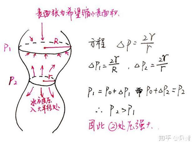 表面張力會像皮筋一樣收縮液體的表面積,同時壓力大(半徑?。┑牡胤降乃粩D到半徑大的地方,使得本來細(xì)的地方半徑變得更小。