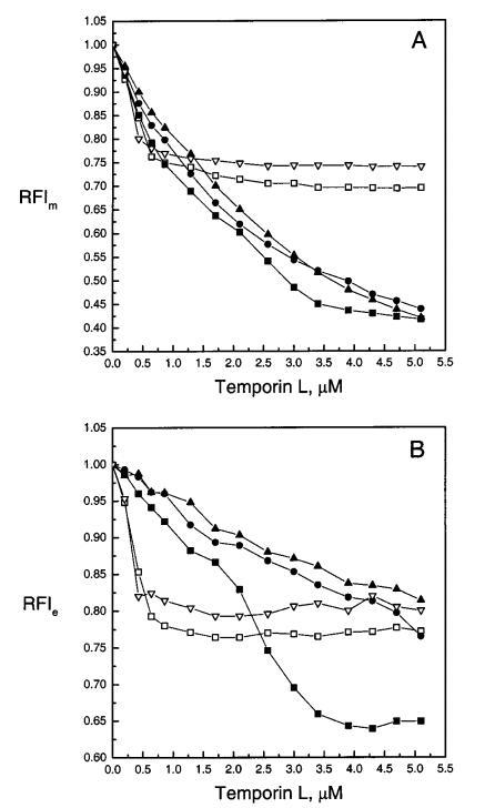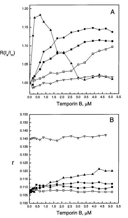 圖4:通過(guò)芘標(biāo)記的磷脂PPDPC(X)0.01的熒光評(píng)估顳葉素L對(duì)LUV中脂質(zhì)動(dòng)力學(xué)的影響,分別顯示為芘單體和準(zhǔn)分子發(fā)射強(qiáng)度Im(圖A)和Ie(圖B)的變化。脂質(zhì)體由SOPC組成,XPOPG為0(0)、0.10(9)、0.20(b)和0.40(2),Xchol為0.10(3)。每個(gè)數(shù)據(jù)點(diǎn)代表三次測(cè)量的平均值。標(biāo)準(zhǔn)偏差小于0.02,為清晰起見(jiàn),未顯示。否則情況如圖2圖例所示。