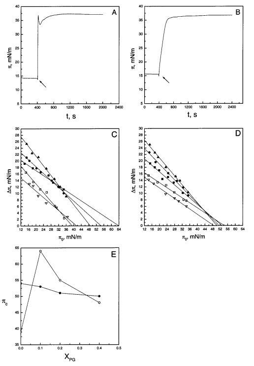 圖1:將時(shí)間蛋白B和L插入脂質(zhì)單層。在初始表面壓力(π0)分別為14.6和15.5 mN/m的情況下,在SOPC/POPG(XPOPG)0.2)單層下方注射顳蛋白B(面板a)或顳蛋白L(面板B)后,表面壓力隨時(shí)間的增加而增加。肽(0.3μM最終濃度)的添加用箭頭標(biāo)記。表面壓力增量(?π)將0.3μM顳蛋白B(圖C)或顳蛋白L(圖D)添加到亞相中導(dǎo)致的脂質(zhì)單分子膜的數(shù)量表示為初始表面壓力(π0)的函數(shù)。SOPC中POPG(XPOPG)的含量分別為0(0)、0.10(9)、0.20(b)和0.40(2)。還顯示了將肽插入具有Xchol)0.1(3)的SOPC膜中。圖E顯示了πc的值,分別作為滲透時(shí)間蛋白B(O)和時(shí)間蛋白L(B)時(shí)XPOPG的函數(shù)。每個(gè)數(shù)據(jù)點(diǎn)代表三次測(cè)量的平均值。標(biāo)準(zhǔn)偏差在0.1和0.8 mN/m之間變化,為清晰起見(jiàn),未顯示。