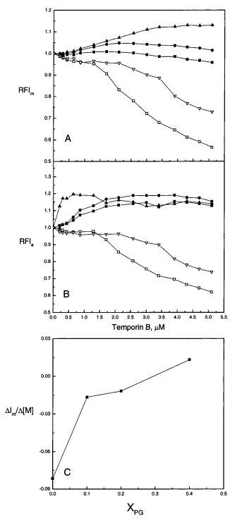 顳蛋白對(duì)雙層脂質(zhì)動(dòng)力學(xué)的影響。隨后通過(guò)記錄摻入LUVs的芘標(biāo)記熒光磷脂類(lèi)似物PPDPC(X)0.01)的發(fā)射光譜來(lái)研究肽與脂質(zhì)體結(jié)合的后果。對(duì)于含有脂質(zhì)類(lèi)似物(如PPDPC)的單個(gè)芘部分,穩(wěn)態(tài)Ie/Im值反映了膜中熒光團(tuán)的橫向遷移率和局部濃度(18,19)。然而,我們之前的研究比較了兩種其他抗菌肽(馬蓋寧2和吲哚肽)對(duì)膜脂質(zhì)動(dòng)力學(xué)的影響,發(fā)現(xiàn)這些肽也影響芘標(biāo)記脂質(zhì)的量子產(chǎn)率(15)。對(duì)于SOPC LUV,添加temporin B分別導(dǎo)致芘單體和準(zhǔn)分子發(fā)射Im和Ie的顯著減少,最大減少約40%(圖2,面板a和B)。芘熒光帶的猝滅是雙相的,當(dāng)時(shí)間蛋白B與脂質(zhì)的摩爾比約為1:12時(shí),量子產(chǎn)率顯著降低(圖2,面板a和B)。在膽固醇(Xchol)0.10)存在的情況下,temporin B對(duì)芘單體和準(zhǔn)分子熒光的猝滅也很明顯,盡管發(fā)射的減少量小于在SOPC LUV中觀察到的減少量(圖2,面板A和B)。然而,當(dāng)酸性磷脂POPG存在于XPOPG)0.10時(shí),Im中只有微不足道的變化是明顯的,當(dāng)XPOPG從0.20增加到0.40時(shí),時(shí)間蛋白B導(dǎo)致Im以漸進(jìn)的方式增加,Im的初始增量在大約2/1的POPG/時(shí)間蛋白B化學(xué)計(jì)量比下趨于穩(wěn)定。在達(dá)到飽和響應(yīng)之前,Im中線性增量的斜率隨著XPOPG而增加(圖2,面板C)。在POPG存在的情況下,顳蛋白B也增加了Ie。在XPOPG)0.40時(shí),Ie的值逐漸增加,直到顳蛋白B:脂質(zhì)摩爾比為≈1:15,對(duì)應(yīng)于≈1/6,而當(dāng)超過(guò)該化學(xué)計(jì)量比時(shí),Ie降低。圖3,面板A中顯示了由于顳蛋白B引起的Ie/Im的變化。具體而言,SOPC LUV的Ie/Im增加了1.1倍,而在膽固醇(Xchol)0.10的存在下,觀察到Ie/Im的微小變化,面板A)。將XPOPG從0.10增加到0.20會(huì)逐漸增強(qiáng)Ie/Im的增量。有趣的是,在XPOPG)0.40時(shí),當(dāng)時(shí)間蛋白B:脂質(zhì)摩爾比為≈1:30.然而,在這一肽:脂比之上,顳葉素B導(dǎo)致Ie/Im降低,而在這一肽:脂比之上,Ie/Im的變化不顯著≈1:6.