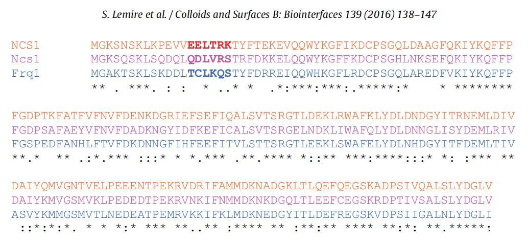 圖1.人類NCS1(橙色)、裂變酵母NCS1(粉紅色)和芽殖酵母Frq1(藍(lán)色)的序列比對(duì)。在鈣存在和不存在的情況下,負(fù)責(zé)肉豆蔻基擠出的基序用紅色表示[29](為了解釋本圖例中對(duì)顏色的引用,讀者請(qǐng)參閱本文的網(wǎng)絡(luò)版本)。