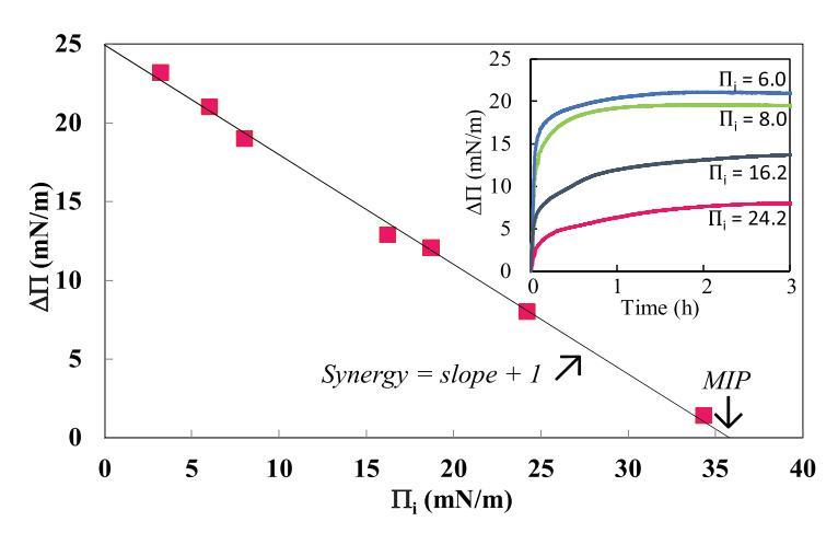 確定綁定參數(shù)的典型示例如圖2所示。實(shí)際上,對(duì)于6.0、8.0、16.2和24.2 mN/m的i,分別獲得了21.0、19.0、12.9和8.0 mN/m的(圖2插圖)。被繪制為i的函數(shù),導(dǎo)致負(fù)斜率。因此,在DPPE存在的情況下,mNCS1的MIP值為35.8±1.1 mN/m,協(xié)同值為0.30±0.02。這種積極的協(xié)同作用表明mNCS1和這種脂質(zhì)單層之間發(fā)生了積極的相互作用。然后,以不同的i注射每種脂質(zhì)和MIP,并根據(jù)表面壓力動(dòng)力學(xué)計(jì)算協(xié)同值。