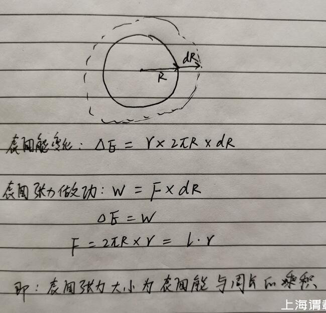 假設(shè)一半徑為R的圓面向外擴(kuò)張距離為dR,這個過程表面張力做功等于表面能的變化。具體推導(dǎo)如下圖。