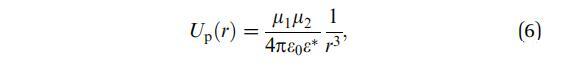 我們將混合單分子膜建模為均勻?qū)?,介電常?shù)em位于兩個(gè)不同的半無(wú)限介質(zhì)(空氣和水)之間。該層由有效偶極密度s垂直于界面的單分散圓形磁疇組成。在該模型中,兩個(gè)磁疇之間產(chǎn)生的偶極對(duì)電勢(shì)Ud可以用以下公式描述: