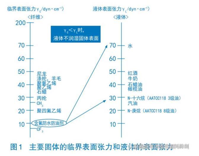 圖2中展示了,含氟防水防油劑通過降低纖維表面張力,達(dá)到優(yōu)異的防水防油效果。如通常棉的臨界表面張力為γc≈200 mN/m,而常溫下水、果汁、油的表面張力分別為72、50、30mN/m,所以棉很容易被以上液體潤(rùn)濕。經(jīng)過含氟整理劑處理后,棉纖維表面張力下降至約10 mN/m,呈現(xiàn)出良好的防水防油性。而無氟防水劑本身的表面張力比較高,只能防水或者防部分水溶性液體(如牛奶、果汁等),達(dá)不到防油的效果。