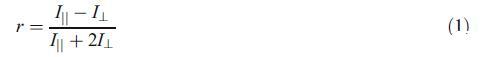所有熒光各向異性測(cè)量均在25.0±0.2°C下使用來自美國的熒光偏振儀器系統(tǒng)(Beacon-2000)進(jìn)行。該儀器配備了100W鹵素?zé)糇鳛榧ぐl(fā)源。羅丹明B(RB)作為熒光探針,其濃度保持在1μM。我們還在12mM純表面活性劑濃度下進(jìn)行了10 nM至2μM探針濃度的各向異性測(cè)量(數(shù)據(jù)未顯示)。選擇飽和r值(探針完全與膠束結(jié)合)下的探針濃度(1μM)作為實(shí)驗(yàn)條件。純和二元混合物的表面活性劑總濃度為12mM。分別使用570和630nm的激發(fā)和發(fā)射波長測(cè)量熒光各向異性。當(dāng)發(fā)射偏振器平行或垂直于偏振激發(fā)方向定向時(shí)?,分別地各向異性是強(qiáng)度差I(lǐng)kI的比率?總強(qiáng)度Ikt2I?如等式1所示: