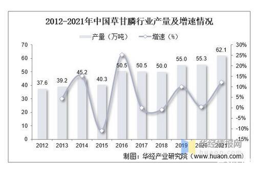 2012-2021年中國(guó)草甘膦行業(yè)產(chǎn)量及增速情況