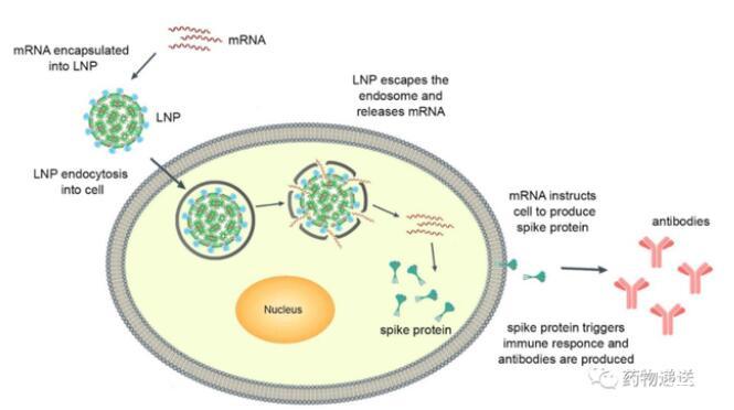 脂質(zhì)納米粒最新的成功案例是作為遞送載體用Pfizer/BioNTech和Moderna獲FDA批準的兩種COVID-19信使RNA(mRNA)新冠疫苗,這兩款疫苗以無與倫比的速度開發(fā)上市,并在流行病毒預防方面有著顯著的效果。疫苗將編碼SARS-CoV-2刺突蛋白的mRNA遞送到宿主細胞的細胞質(zhì)中,被翻譯成刺突蛋白充當抗原,對病毒產(chǎn)生免疫反應。