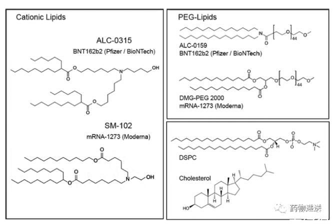 兩款mRNA疫苗采用的脂質(zhì)納米粒組成非常相似。都含有可電離的脂質(zhì),該脂質(zhì)在低pH值時帶正電利于與mRNA靜電作用絡合,在生理pH值時呈中性促進mRNA的遞送和釋放并減少潛在的毒性。都含有聚乙二醇化脂質(zhì),以減少血清蛋白的抗體結合和吞噬細胞的清除,從而延長全身循環(huán)時間。磷脂二硬脂酰磷脂酰膽堿(DSPC)和膽固醇形成穩(wěn)定結構有助于包載mRNA。兩款疫苗的可電離陽離子脂質(zhì):PEG-脂質(zhì):膽固醇:DSPC的摩爾比分別為46.3:1.6:42.7:9.4(Pfizer/BioNTech)和50:1.5:38.5:10(Moderna)。脂質(zhì)納米粒的粒徑為80~100nm,每個脂質(zhì)納米粒中包含有約100個mRNA分子。