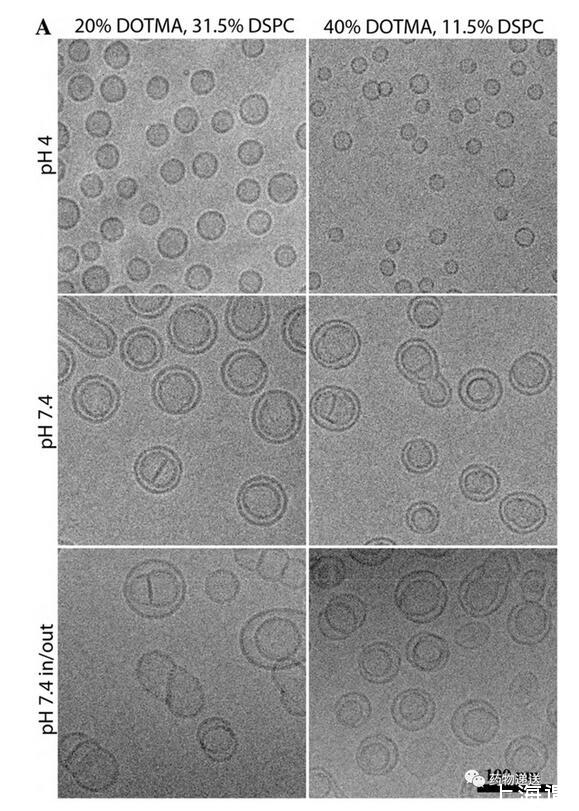 此外還發(fā)現,采用乙醇稀釋/快速混合技術制備LNP-siRNA,當siRNA含量較高時,表現為堆疊的小雙層結構,其中siRNA被包載于緊密相連的脂質雙分子層之間;當siRNA含量較低時,堆疊結構的比例降低,LNP-siRNA復合物系統(tǒng)則表現出siRNA雙層結構和非晶態(tài)電子致密核的組合,這可能是由中性形式的可電離陽離子脂質產生的油滴而形成。所得結論為:含可電離陽離子脂質的LNP體系在pH=4時形成雙層結構,在pH=7.4時形成非晶態(tài)“固體核”結構。