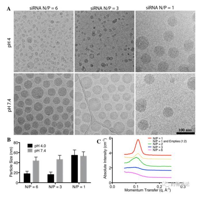 使用帶電荷脂質制備siRNA-LNP時,正電荷與負電荷的數量比會影響納米粒的大小、穩(wěn)定性、電位等性能。在siRNA-LNP中,正電荷通常為具有可電離銨根(N)的陽離子脂質,而負電荷則為帶有大量磷酸根(P)的核酸分子,兩者可通過靜電吸附的方式結合在一起。因此,不合理的比例可能會導致粒徑過大、穩(wěn)定性差等缺陷。值得一提的是,在研究中發(fā)現,當N/P=1時,pH中和后LNP的粒徑不會有較大改變;當N/P=3或者6時,LNP在pH=7.4的緩沖液中粒徑會變大。而永久陽離子脂質(例如DOTAP)制備的LNP在任何pH緩沖液中都不具有固體核心結構。