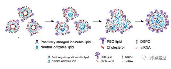 在有siRNA存在的情況下,最初是在緊密相連的脂質單層之間形成包含siRNA的小囊泡;隨著pH值的升高,類似于不含siRNA的LNP,可電離脂質電位的中和會誘導脂質顆粒間的融合,這個過程受到復合物中PEG脂質、DSPC和膽固醇的相分離限制;有科學家提出,這些脂質沉積在表面單層,抑制脂質顆粒進一步融合。值得注意的是,高濃度乙醇(體積比不小于25%)會導致除單個脂質分子的高交換率(與siRNA復合的陽離子脂質除外),從而使得快速形成平衡結構;還需要指出的是,必須要有部分DSPC和膽固醇被分割在外單層,并且在pH=4時能維持更小結構的穩(wěn)定,因為在含有1.5 mol % PEG脂質且沒有DSPC或膽固醇的體系中能觀察到非常大的微米級系統(tǒng);隨著pH的升高,納米顆粒經歷的過程與不含siRNA時LNP的情況基本相同;可電離脂質向中性形式轉化的過程更利于增加在LNP內核中的融合和沉積。