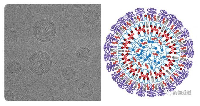LNP-siRNA復合物是通過快速混合-乙醇稀釋過程形成,該復合物并沒有顯示出倒置的膠束結構,其中siRNA以“醋栗小圓面包”(currant bun)的形式分散在LNP內部。相反,siRNA與緊密貼合的脂質雙層膜相關,雙層脂質膜固定住siRNA分子,分離到LNP的外圍。過量的可電離陽離子脂質會形成一個無定形的脂質核心,類似于含有一定量膽固醇的油滴相。