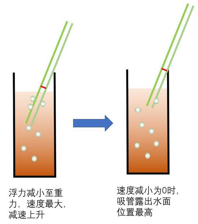 這時上升過程中,吸管可能因?yàn)樽笥覂蓚?cè)吸附的氣泡數(shù)量不同而發(fā)生浮力差異而傾斜。也可能因?yàn)橥饨鐢_動而發(fā)生傾斜,反正吸管豎直上升的可能性很小。習(xí)慣傾斜碰到瓶壁后繼續(xù)上升,上升帶來氣泡的減少,吸管自身浮力的下降。當(dāng)浮力減小到小于重力時,這時開始i減速,直到速度為零。如下圖所示;