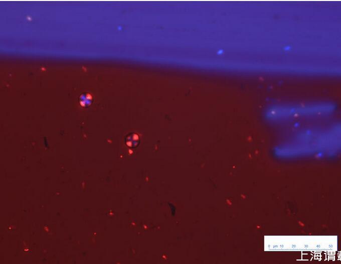 紅色的部分為墨水殘余物的涂片,藍(lán)紫色是載玻片本身在偏光鏡下的顏色。圖中可以看到兩個標(biāo)準(zhǔn)的馬耳他十字,基本上能夠驗(yàn)證“sheen是結(jié)晶導(dǎo)致”這一說法
