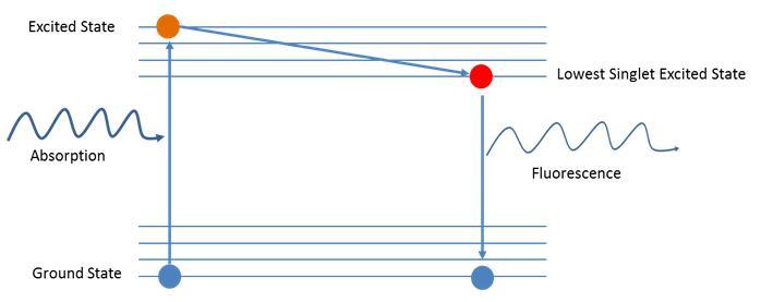 染料分子需要在接收到特定波長的光之后,才能從基態(tài)到激發(fā)態(tài),電子再迅速回到基態(tài),這個過程損失的能量就會以另一個特定波長光的形式釋放,在視頻中的例子就是吸收約350nm的紫外線,再放出藍(lán)色的可見光。