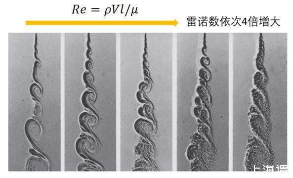 隨著雷諾實驗和雷諾數(shù)被提出來以后,近代流體力學,尤其是湍流理論的發(fā)展出現(xiàn)了一個前所未有的盛況,而粘性與湍流的關系也順理成章的轉化成了雷諾數(shù)和湍流的關系。1974年刊登于《流體力學》期刊中的一篇經(jīng)典文章,通過流動顯示技術生動形象的描繪了雷諾數(shù)和流態(tài)的關系:隨著雷諾數(shù)的增大,渦旋的整體形狀和尺度基本一致,然而射流摻混的渦系結構卻越來越豐富。