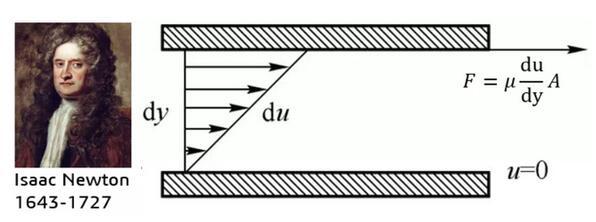 正如前面所說,人們很早便感受到了流體具有“粘”的屬性,但是如何從科學上表達流體的粘性成為了一個新的問題。作為世界物理學界金字塔尖的男人,牛頓幾乎霸屏了整個中學物理課本,當然也沒有放過流體。1686年,牛頓經(jīng)過大量的實驗研究,提出了著名的“內(nèi)摩擦定律”——流體的內(nèi)摩擦力(即粘性力)的大小與流體的性質(粘性系數(shù)μ)有關,并與流體的速度梯度和接觸面積成正比。