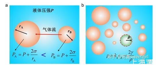 氣泡液體是大小不同的球狀氣泡分散到液體中的液氣體系。在氣泡液體中,大小不同氣泡是一個不穩(wěn)定的體系,其內(nèi)部不等的壓強(qiáng)會使整個體系變化,總體趨勢是氣泡半徑出現(xiàn)粗化現(xiàn)象,這種粗化跟晶體生長中的Ostwald熟化的現(xiàn)象是一致的(Ref 1)。根據(jù)附加壓力公式,可知較小的氣泡其內(nèi)部具有較大的壓強(qiáng),因此與旁邊較大的氣泡間就會存在壓強(qiáng)差(圖1a),氣泡間液體兩側(cè)的壓強(qiáng)差會使氣體從壓強(qiáng)較大的地方向較小的地方擴(kuò)散,從而出現(xiàn)大的氣泡增大,小的氣泡減小直至消失的情形,這就是氣泡Ostwald熟化的機(jī)理(Ref 2)。從能量的觀點(diǎn)來說,Ostwald熟化的結(jié)果降低了體系的表面能,從而使整個體系更加穩(wěn)定。