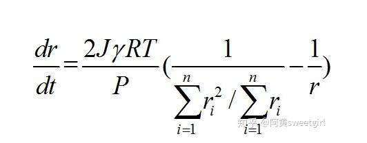假設(shè)氣體符合氣體理想氣體方程,即PV=nRT,對于球形氣泡,體積V=4πr^3/3,從而可把摩爾速率轉(zhuǎn)化為氣泡半徑變化的速率。通過以上各式,可得