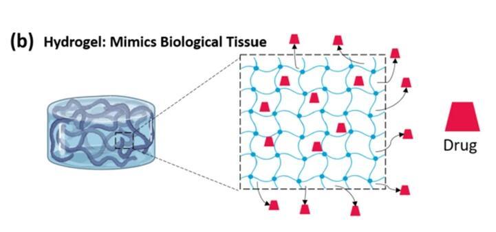 水凝膠是通過物理或化學交聯(lián)方法形成的三維聚合物網(wǎng)格。網(wǎng)格之間留有一定的空間,由于該網(wǎng)格的存在,水凝膠的結構富含多孔性。聚合物網(wǎng)格可以截留大量的水,并防止其運輸?shù)酵獠凯h(huán)境,從而模仿生物組織的物理特性。這種保水能力,使水凝膠能夠提供良好的生物相容性和封裝藥物分子的平臺。該網(wǎng)格可以限制不同酶的滲透,從而保護包封的藥物免受各種酶降解。
