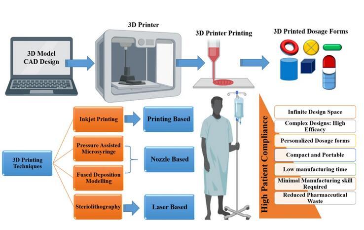 3D打印技術中不需要造粒、壓片以及包衣等環(huán)節(jié),并且可以靈活控制藥物的劑量以及釋放,所以該技術逐漸發(fā)展起來。3D打印技術主要有選擇性激光燒結(SLS)、光固化成型(SLA)、熔融沉積成型(FDM)、半固體擠出成型(SSE)以及噴墨成型打?。↖JP)等方式。3D打印藥物目前的代表藥物,為FDA批準的Spritam。