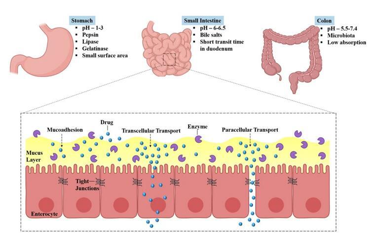 口服藥物在經(jīng)歷胃部的生理障礙后到達小腸。在小腸(十二指腸)的入口處,胰酶會引發(fā)幾種酶促轉化,這些酶還可能導致首過代謝,從而導致藥物生物利用度降低。因此,口服藥物必須克服這些生理學障礙。