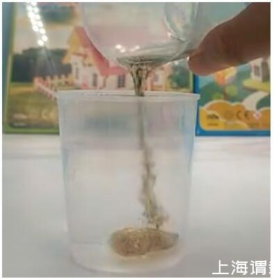 3.另取一只透明杯子2號(hào),裝入大半杯水,將1號(hào)杯子中的油倒入2號(hào),就能看到彩虹雨了。