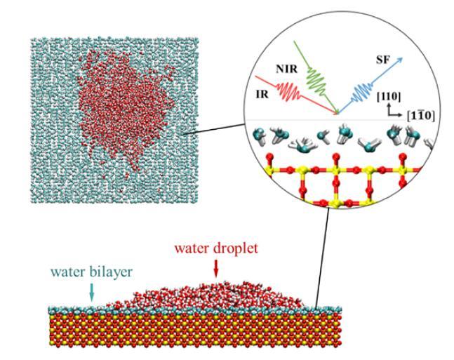 以TiO2的Rutile晶型110表面為例,和頻共振光譜實(shí)驗與理論發(fā)現(xiàn)常溫下該表面上有序雙層水結(jié)構(gòu),且該有序結(jié)構(gòu)導(dǎo)致水層上水滴存在。
