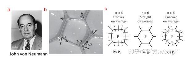 比如,依據(jù)Plateau第一定律,可以推出,相鄰三個相互接觸的氣泡的三條邊界上的曲率之和為零(Curvature sum rule)。其中最重要地是1952年von Neumann利用它推導(dǎo)出了二維泡沫的演變方程(Ref 3)。