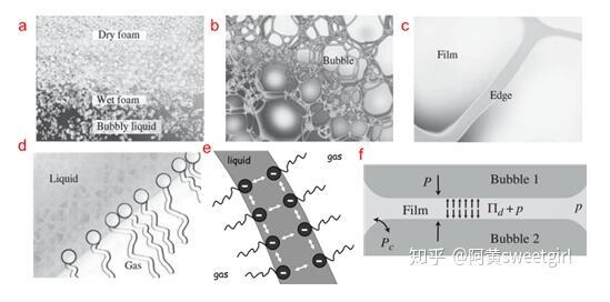 圖1.不同尺度下的泡沫結(jié)構(gòu)及穩(wěn)定機制(Ref 1)(a)整個泡沫結(jié)構(gòu),尺度為0.01 m至1 m。(b)干泡沫的放大部分,尺度為0.1 mm至1 cm。(c)液體通道,也叫Plateau邊界,尺度為1 um至0.1 mm以及肥皂泡膜,尺度為10 nm到1 um。(d)氣液界面的分子層結(jié)構(gòu),尺度為0.1 nm到10 nm。e-f)氣泡膜在界面靜電力排斥作用即楔裂壓(disjoining pressure)的作用下而穩(wěn)定存在。