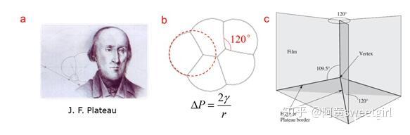 泡沫物理學集中于研究泡沫的結(jié)構(gòu)、靜力學、動態(tài)演變及排液等內(nèi)容。它是一個十分古老的學科,由比利時物理學家Plateau在19世紀中葉開創(chuàng)(圖2a)。Plateau在數(shù)十年的失明的時光里,依舊通過指導(dǎo)他侄子做試驗,堅持研究肥皂泡薄膜的幾何形態(tài)及其背后隱藏的力學規(guī)律。1873年,他和侄子把自己的實驗現(xiàn)象和分析結(jié)果做了系統(tǒng)整理,以法文發(fā)表,從此把對泡沫結(jié)構(gòu)的研究由定性印象推到了量化階段,開創(chuàng)了泡沫物理學(Ref 2)。在泡沫靜力學方面,Plateau的主要貢獻在于其提出了干泡沫的靜態(tài)結(jié)構(gòu)力學的三定律,它是后續(xù)泡沫研究的基石: