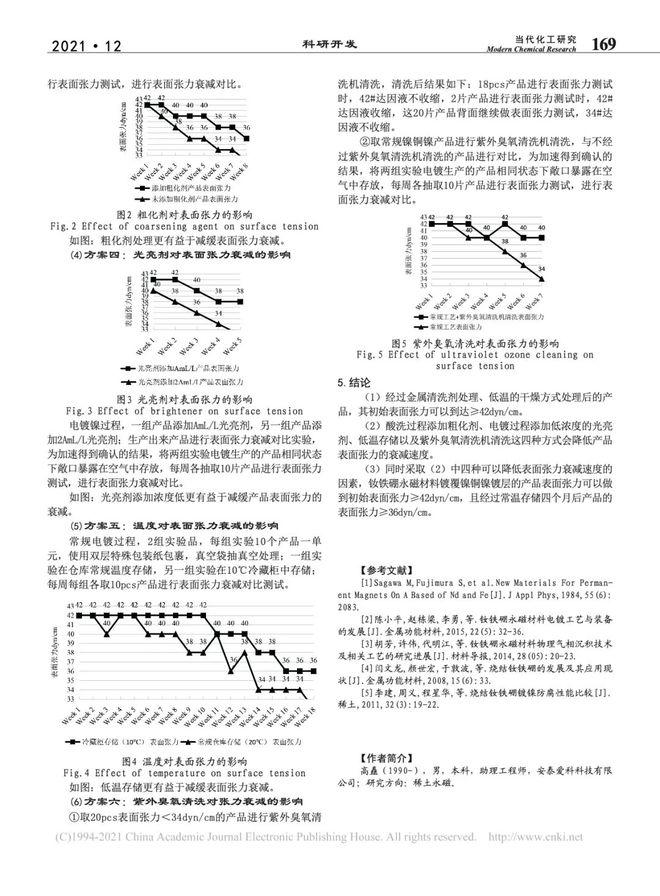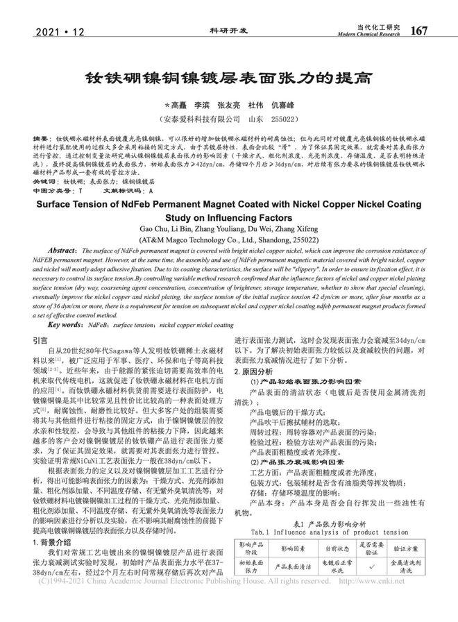 摘要:釹鐵硼永磁材料表面鍍覆光亮鎳銅鎳,可以很好的增加釹鐵硼永磁材料的耐腐蝕性;但與此同時(shí)對鍍覆光亮鎳銅鎳的釹鐵硼永磁材料進(jìn)行裝配使用的過程大多會(huì)采用粘接的固定方式,由于其鍍層特性,表面會(huì)比較"滑",為了保證其固定效果,就需要對其表面張力進(jìn)行管控。通過控制變量法研究確認(rèn)鎳銅鎳鍍層表面張力的影響因素(干燥方式、粗化劑濃度、光亮劑濃度、存儲(chǔ)溫度、是否表明特殊清洗),最終提高鎳銅鎳鍍層的表面張力,初始表面張力≥42dyn/cm,存儲(chǔ)四個(gè)月后≥36dyn/cm,對后續(xù)有張力要求的鎳銅鎳鍍層釹鐵硼永磁材料產(chǎn)品形成一套有效的管控方法。