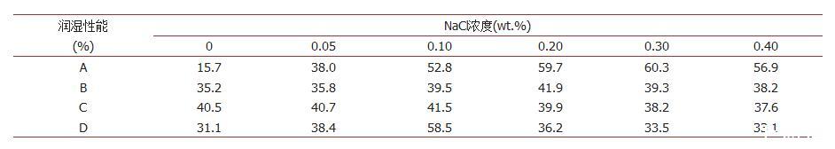 同樣根據(jù)滲透實(shí)驗(yàn)結(jié)果進(jìn)行潤(rùn)濕性能計(jì)算,具體見(jiàn)表3。由表3可以看到,抑塵劑A對(duì)NaCl最為敏感,隨著無(wú)機(jī)鹽含量的增加,抑塵劑在煤塵表面的潤(rùn)濕能力持續(xù)提高。當(dāng)加入0.3%NaCl時(shí),抑塵劑潤(rùn)濕相同煤塵高度所需要的時(shí)間降低至194 s,其潤(rùn)濕性能由15.7%提升至60.3%,在煤塵表面的潤(rùn)濕程度最高提升3.8倍左右;抑塵劑C對(duì)NaCl最不敏感,隨著NaCl濃度的增加,C溶液的潤(rùn)濕性能變化均比較小,潤(rùn)濕性提高程度不超過(guò)1%。對(duì)于四種抑塵劑A,B,C和D,它們對(duì)應(yīng)最佳提高潤(rùn)濕性能的NaCl濃度分別為0.3%、0.2%、0.1%和0.1%。