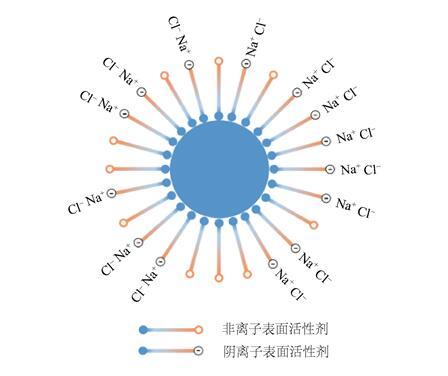 抑塵劑主要由陰離子表面活性劑、非離子表面活性劑以及其他助劑組成。其中,表面活性劑是一種具有兩親性的物質(zhì),加入少量能使其溶液體系的界面狀態(tài)發(fā)生明顯變化,是抑塵劑的重要組成部分。如圖4所示,煤塵表面暴露著大量的極性有機(jī)基團(tuán),水在煤塵表面很難發(fā)生潤(rùn)濕行為;抑塵劑中的表面活性劑親油端與煤塵表面的有機(jī)基團(tuán)具有較好的相容性,能夠在煤塵表面定向排列并且將親水基團(tuán)引入煤塵表面,增加了水與煤塵之間的潤(rùn)濕能力。無(wú)機(jī)鹽的引入對(duì)于陰離子表面活性劑具有增效作用。根據(jù)雙電層理論,雙電層可以分為緊密層和擴(kuò)散層,當(dāng)溶液中加入無(wú)機(jī)鹽后,無(wú)機(jī)鹽中的離子會(huì)壓縮擴(kuò)散層,使得擴(kuò)散層厚度減小,從而降低了界面能;同時(shí)其無(wú)機(jī)鹽離子還能減小雙電層中的靜電力作用,促進(jìn)了抑塵劑在煤塵表面的吸附,提高了潤(rùn)濕性能。