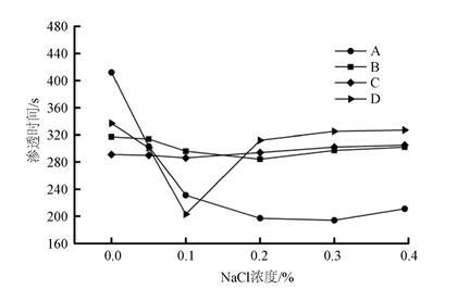 從圖4可知,NaCl對(duì)于提高抑塵劑潤(rùn)濕性能的作用更為顯著。因此,在抑塵劑中加入不同濃度的NaCl,研究無(wú)機(jī)鹽濃度對(duì)煤塵NR的潤(rùn)濕性能的影響。如圖5所示,少量的NaCl的引入,能夠降低抑塵劑在煤塵表面的滲透時(shí)間。NaCl的引入能夠降低抑塵劑溶液的表面張力,使抑塵劑在煤塵表面的接觸角不斷降低[18]。另外,無(wú)機(jī)鹽能夠增強(qiáng)表面活性物質(zhì)在煤塵表面的吸附能力,降低煤塵與抑塵劑之間的界面能,提高了抑塵劑對(duì)煤塵的潤(rùn)濕性能;煤塵中含有大量的酚羥基、羧基等有機(jī)基團(tuán),因此煤塵表面呈現(xiàn)電負(fù)性[19]。當(dāng)NaCl含量持續(xù)增加時(shí),抑塵劑A、B、C在煤塵表面的滲透時(shí)間趨于平穩(wěn),而抑塵劑D出現(xiàn)滲透時(shí)間增加后平緩的趨勢(shì)。相比之下,抑塵劑B、C對(duì)于NaCl的敏感程度較低,隨著NaCl含量增加其潤(rùn)濕能力變化不大;NaCl對(duì)抑塵劑A、D在煤塵表面的潤(rùn)濕能力影響程度較大。