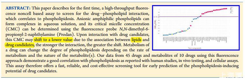 本文首次描述了一種與磷脂質(zhì)相關(guān)的高通量熒光。陰離子兩親磷脂可以在水溶液中形成復(fù)合物,其臨界膠束濃度(CMC)可以使用熒光探針N,N-二甲基-6-丙酰-2-萘胺(Prodan)測定。在與候選藥物相互作用時,由于脂質(zhì)和候選藥物之間的關(guān)聯(lián),該CMC可能會轉(zhuǎn)變?yōu)檩^低的值,相互作用越強(qiáng),轉(zhuǎn)變越大。藥物的代謝可以根據(jù)代謝速率和代謝物的性質(zhì)改變磷脂質(zhì)的程度。我們使用這種熒光方法從45種藥物和10種藥物的代謝物獲得的數(shù)據(jù)證明了與人體研究、體內(nèi)測試和細(xì)胞分析報告的磷脂沉積癥有良好的相關(guān)性。因此,該測定提供了一種快速、可靠且具有成本效益的篩選工具,用于早期預(yù)測候選藥物的磷脂沉積誘導(dǎo)潛力。