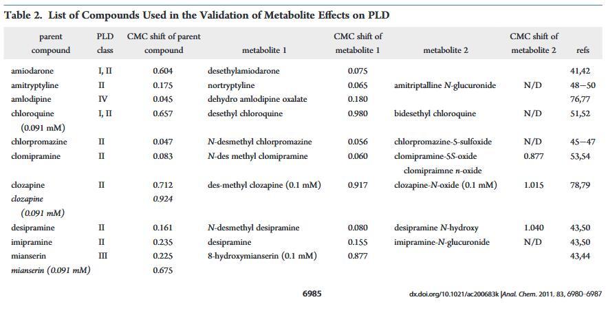 已經(jīng)有許多出版物描述了PLD藥物代謝產(chǎn)物所致。其中,初級代謝輕的胺碘酮,去乙基胺碘酮,已經(jīng)討論過14,38-40優(yōu)先積累代謝物已觀察到胺碘酮過量,尤其是短期39這為我們的檢測數(shù)據(jù)提供了可能的解釋其中去乙基胺碘酮是胺碘酮的主要代謝物,41,42表現(xiàn)出更高的PLD誘導(dǎo)潛力。相似地,8-羥基米安色林之間的CMC位移差異,米安色林、43,44和米安色林的主要氧化代謝物比其他兩個之間的差異更顯著成對的親本和代謝物。由于溶解度的限制,父母和代謝組的劑量濃度不同氯氮平和米安色林。這可能是導(dǎo)致觀察到的CMC偏移的顯著差異母體和代謝物之間。在較低濃度下測試時相比之下,氯氮平從低電位誘導(dǎo)劑轉(zhuǎn)變?yōu)榉钦T導(dǎo)劑,而米安色林仍然作為誘導(dǎo)劑但具有更高的CMCDL/CMCL值。值得注意的是,目前測試集中的大多數(shù)CAD被報告為氧化代謝其相應(yīng)的脫烷基初級代謝物。為了了解相應(yīng)初級的PLD電位代謝物,我們測試了額外的代謝物。之間測試的代謝物是初級去甲基代謝物氯丙嗪、45?47阿米替林、48?50丙咪嗪、43,50和pri-氯喹的瑪麗和次級脫乙基代謝物。51,52此外,由雜原子氧化形成的氧化代謝物地昔帕明43,50和氯胺酮的重釋和脫烷基代謝物pramine53,54進(jìn)行了評估。與其他CAD一樣,代謝物可以如果它們具有合適的理化性質(zhì),則誘導(dǎo)PLD。32相反,代謝物將失去結(jié)合能力如果CAD特征丟失,則使用脂質(zhì),例如用脂質(zhì)觀察氯米帕明N-氧化物和地昔帕明N-羥基(圖4和表2)。
