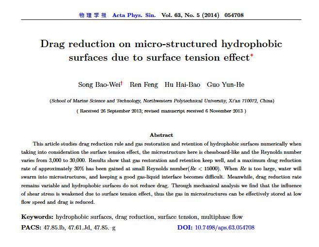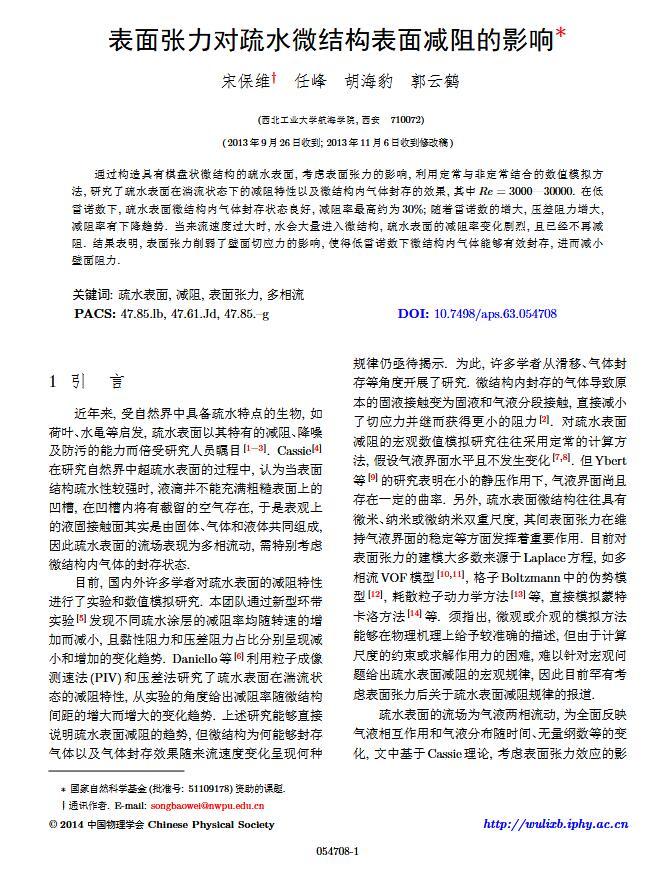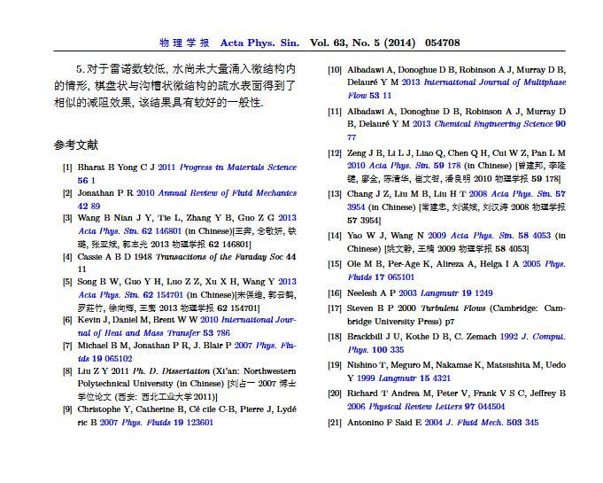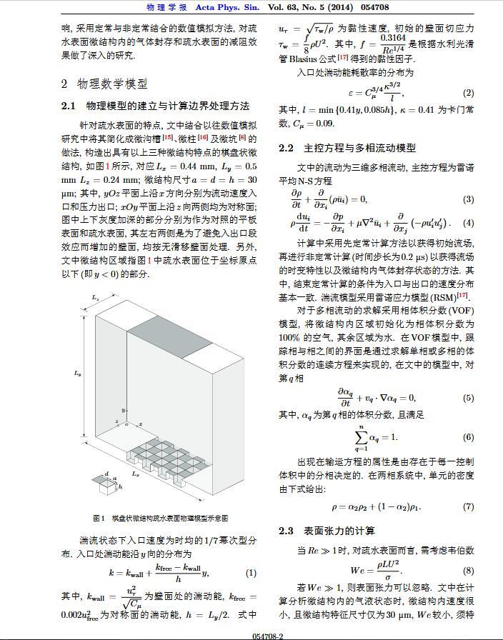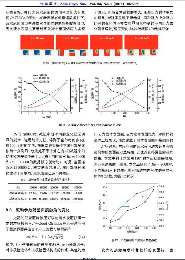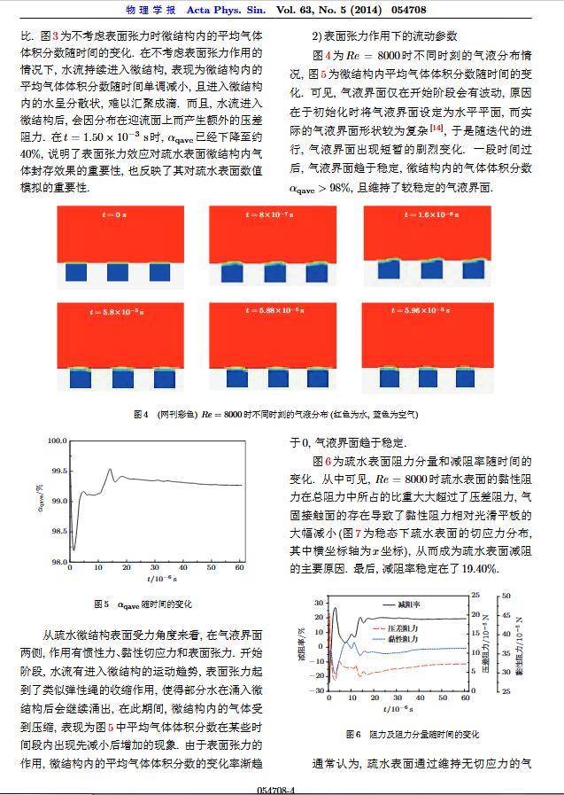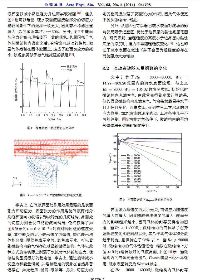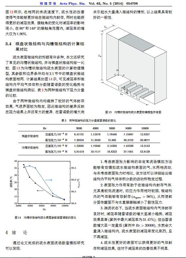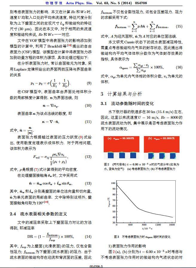 通過構(gòu)造具有棋盤狀微結(jié)構(gòu)的疏水表面,考慮表面張力的影響,利用定常與非定常結(jié)合的數(shù)值模擬方法,研究了疏水表面在湍流狀態(tài)下的減阻特性以及微結(jié)構(gòu)內(nèi)氣體封存的效果,其中Re=3000—30000.在低雷諾數(shù)下,疏水表面微結(jié)構(gòu)內(nèi)氣體封存狀態(tài)良好,減阻率最高約為30%;隨著雷諾數(shù)的增大,壓差阻力增大,減阻率有下降趨勢.當(dāng)來流速度過大時,水會大量進(jìn)入微結(jié)構(gòu),疏水表面的減阻率變化劇烈,且已經(jīng)不再減阻.結(jié)果表明,表面張力削弱了壁面切應(yīng)力的影響,使得低雷諾數(shù)下微結(jié)構(gòu)內(nèi)氣體能夠有效封存,進(jìn)而減小壁面阻力.