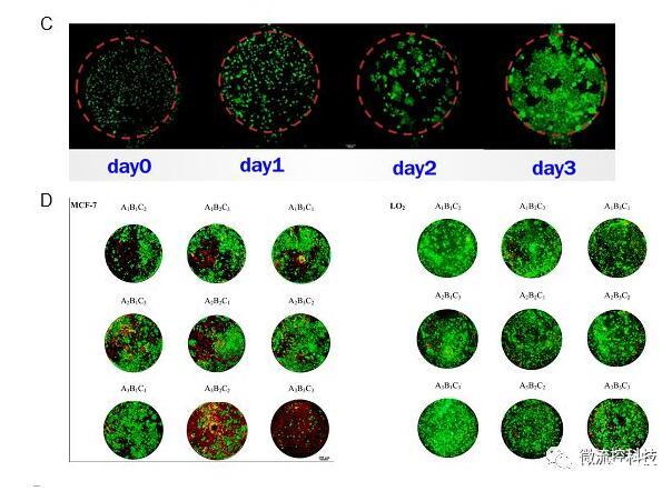 圖4A.微流控腫瘤微陣列藥物測(cè)試系統(tǒng)包含一種復(fù)合式結(jié)構(gòu)開放式微流控芯片以及移液工作站;B.微流控芯片上腫瘤微環(huán)境重建的示意圖。3D培養(yǎng)腫瘤細(xì)胞模擬腫瘤實(shí)質(zhì),水凝膠模擬支持和滋養(yǎng)腫瘤細(xì)胞的腫瘤基質(zhì),納米孔薄膜擴(kuò)散屏障模擬血管內(nèi)皮層;C.微流控芯片上連續(xù)三天內(nèi)MCF-7乳腺癌細(xì)胞增殖情況。(Calcein-AM/EthD-1染色,比例尺:200μm);D.抗腫瘤藥物正交組合測(cè)試結(jié)果。藥物測(cè)試包括LO2肝細(xì)胞和MCF-7乳腺癌細(xì)胞對(duì)A.阿霉素,B.紫杉醇和C.順鉑的3因素3水平正交組合藥物的反應(yīng)。